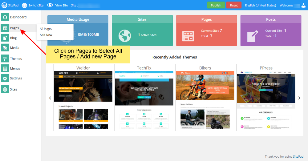 Setelah icon sitepad di klik maka akan masuk ke halaman sitepad website builder,setelah itu klik di menu Pages bisa ke select all atau ke add new,jika di klik select All Pages disana anda bisa memanage setiap halaman bisa melakukan view,edit,delete dll