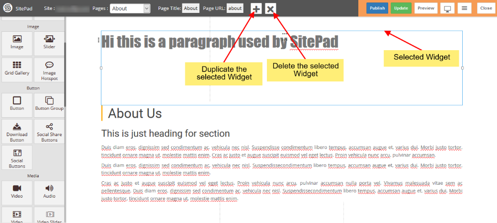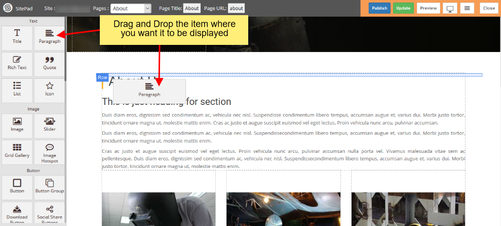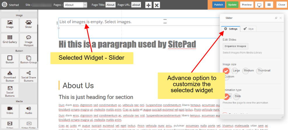Anda juga dapat menyeret dan menjatuhkan Widget yang berbeda di mana pun anda ingin untuk melihat elemen. Ada banyak Widget yang berbeda seperti Judul, Paragraf, Penggeser, Kotak Servis, Teks Kaya, Gambar, Video, dll.