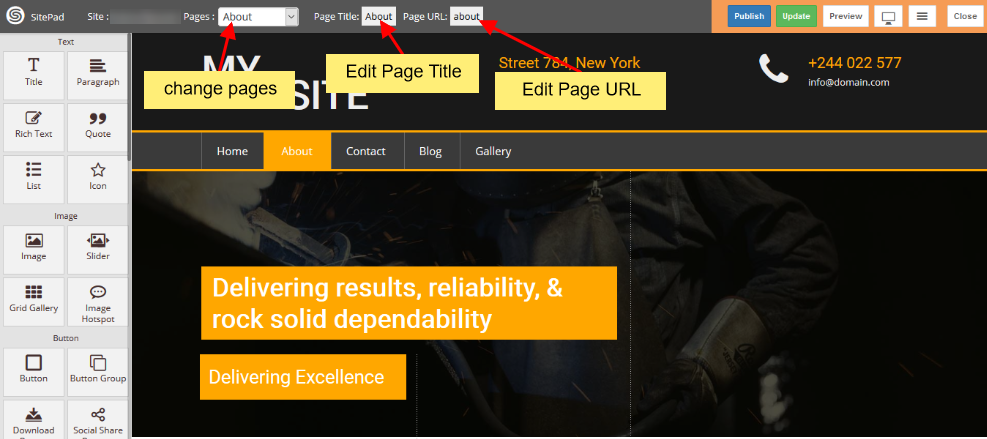 Jika anda melakukan klik di Add New Page maka akan diarahkan ke halaman editor Sitepad. Disana anda bisa melakukan pemilihan page mana yang di Edit,bisa melakukan editing Judul / Page Title dan Page Url yang di gunakan misalkan Judul / Page Title menggunakan nama About dan bagian Page Url di isi About maka hasilnya akan menjadi namadomain.com/about
