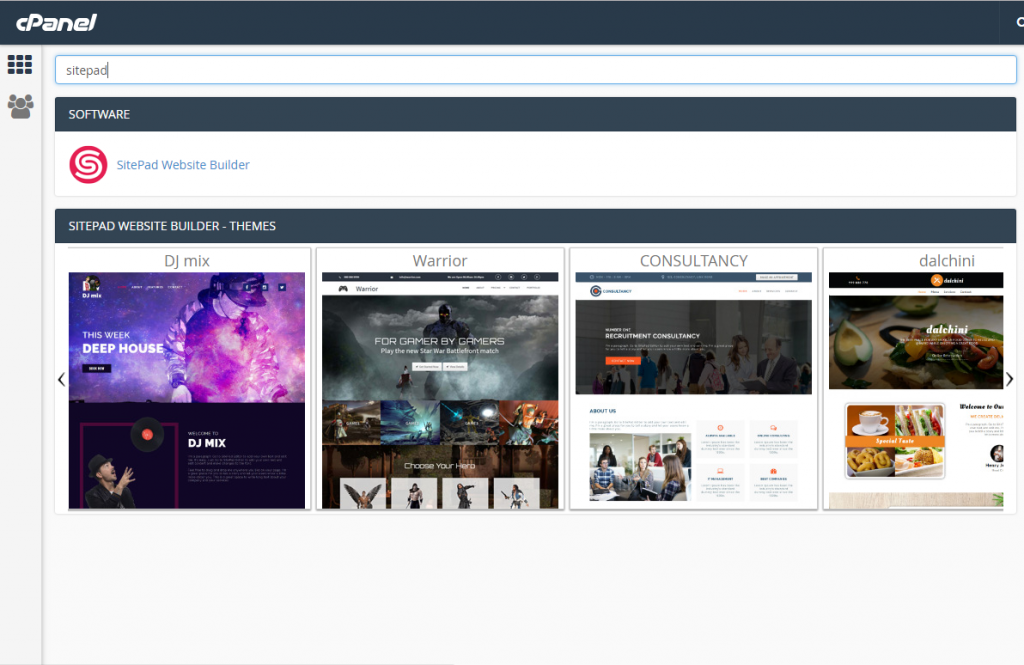 Pertama kita login terlebih dahulu ke cpanel kita melalui url namadomain.com/cpanel atau bisa via portal qwords. Setelah masuk cPanel langsung ketik sitepad di kotak pencarian di cPanel sesuai dengan screenshot dan klik icon sitepad website builder setelah itu akan di arahkan ke halaman sitepad website builder.