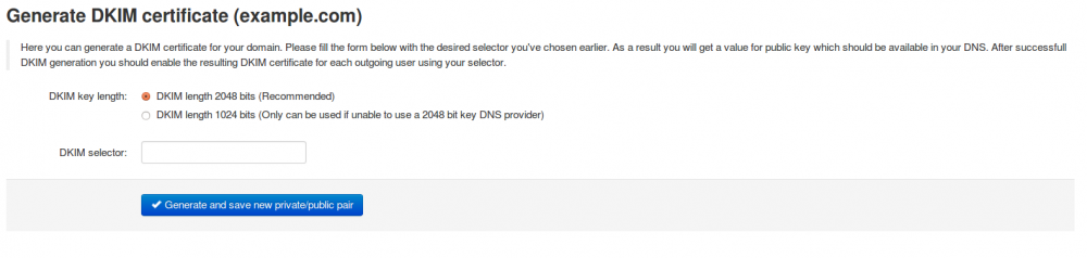 Di sini Anda dapat menghasilkan DKIM untuk domain Anda. Anda akan perlu memilih selector yang