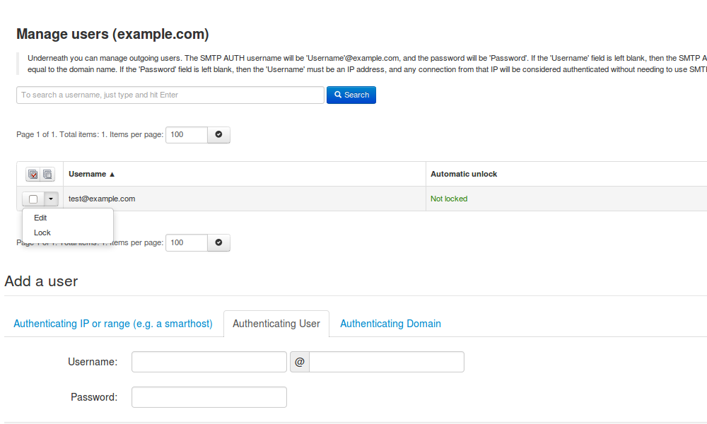 Dengan opsi ini Anda dapat membuat / mengelola pengguna Outgoing/SMTP.