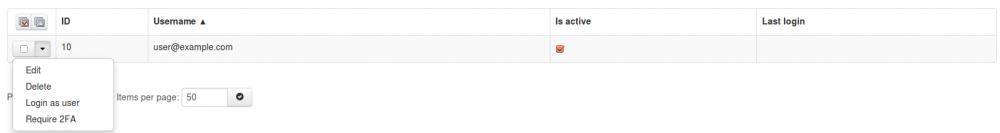 Sebagai pengguna dengan level yang lebih tinggi, Anda juga memiliki kemampuan untuk “Login as user”  Jika Anda memilih pengguna Email di ‘Manage Email Users’ dan tekan panah hitam dropdown anda akan melihat beberapa opsi seperti: