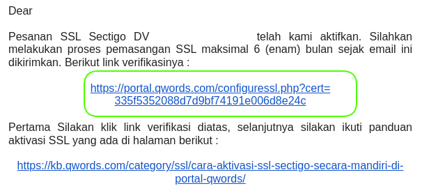 1. Perlu sahabat Qwords ketahui, setelah selesai melakukan pemesanan dan pembayaran SSL DV Sectigo di website Qwords Utama, Kita akan mendapatkan Token yang dikirimkan ke alamat email Sahabat Qwords yang terdaftar di Portal Client. Contoh Emailnya seperti berikut :