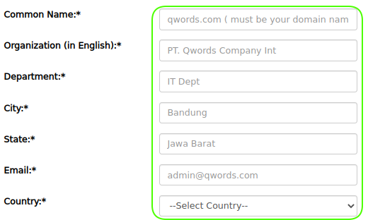 5. Untuk domain tipe Wildcard, pastikan menggunakan format star dot (*.contoh.com), ya. Sedangkan, untuk SSL Multi Domain, pastikan sudah mengisi Domain Name 1, 2 dan seterusnya, ya.