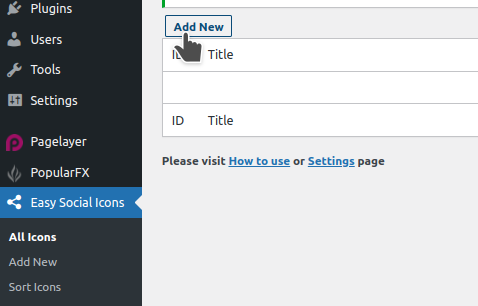 4. Kembali ke Dashboard WordPress. Pilih plugin Easy Social Icons di menu bar. Lalu, klik Add New.