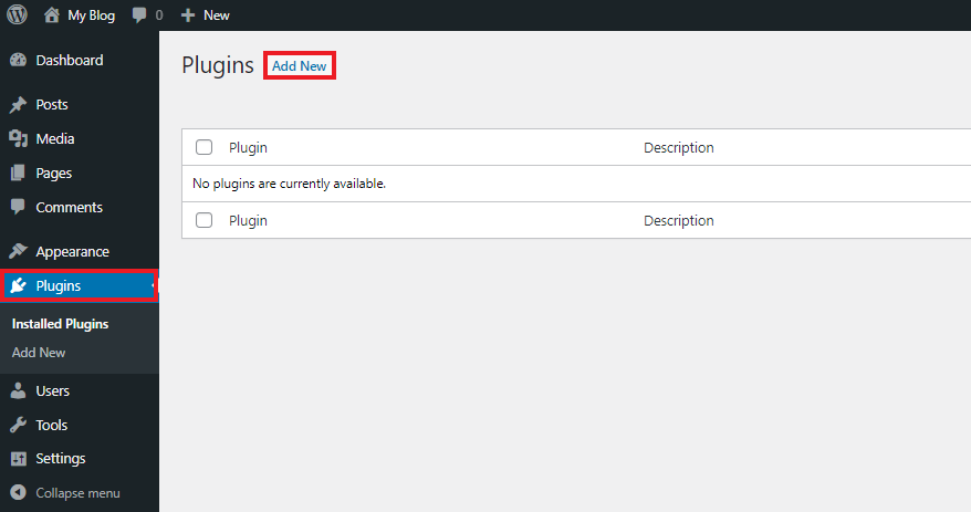 2. Pilih menu Plugins pada menu bar. Lalu, klik Add New di bagian atas.