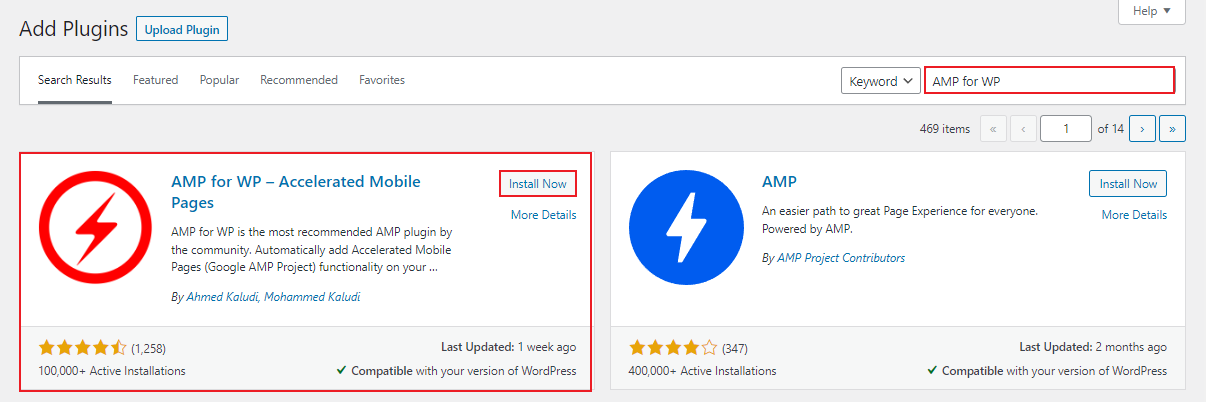 2. Cari plugin AMP for WP pada search bar. Lalu, klik Install Now dan Activate.