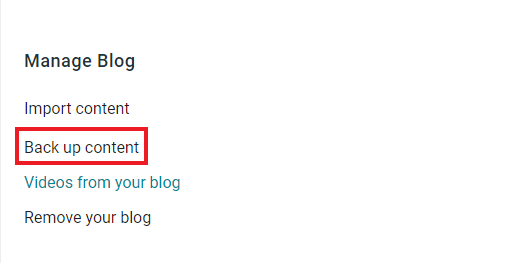 4. Scroll ke bawah sampai pada menu Manage Blog. Lalu, klik Back up content.